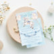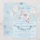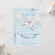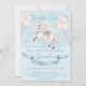 Convite de aniversário tema cavalo com ilustração de um lindo cavalo branco mágico bebê e estrelas douradas de conto de fadas em aquarela com balões em cores pastéis e laço azul para celebração!