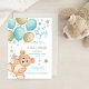 O convite para chá de fraldas de um menino azul e dourado bonito apresenta um ursinho de pelúcia a aquarela voando em um pacote de balões com um borrifo de estrelas. Trabalho de arte por KL Stock.