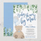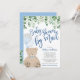 chá de fraldas de ursinho por correio apresenta aquarela eucalipto, balões, fonte azul de escrita de caligrafia moderna e ursinho castanho.