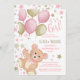 O convite para chás de fraldas de garotas bonitas, cor-de-rosa e douradas, apresenta um ursinho de peluche d'água voando em um pacote de balões com um borrifo de estrelas. Trabalho de arte por KL Stock.
