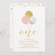 Celebre um dia especial para seu amado com este belo convite para o primeiro aniversario! Este design apresenta a tipografia de na moda com "Um" com balões e confetti em cor rosa, cinzas e combinação de cores douradas. Combine seu convite com suas decorações de festa de aniversário. Convite perfeito para uma festa de aniversário moderna para uma garota.
