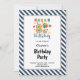 Este "Convite de aniversário 8.º Frame das listras azuis/brancas" apresenta um quadro listrado azul e branco com um gráfico agradável. Prepare-se para aproveitar uma ocasião memorável, faça o pedido hoje!