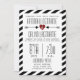 Um convite de casamento com ilustração de um coração vermelho entre duas setas. O fundo é faixas diagonais brancas e pretas. Personalize o texto com suas informações.