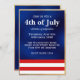 Este convite de festa personalizado apresenta um tema elegante e patriótico do Dia 4 de Julho sobre um fundo de estilo metálico em azul-marinho escuro. Uma faixa de listras vermelhas e brancas é colocada ao longo da parte inferior para representar a bandeira americana. O título da festa "4 de Julho" é impresso no centro em uma fonte branca grande, seguido pelas informações do evento. Uma moldura em estilo de folha dourada cerca o convite.