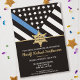 Este design apresenta uma bandeira da força policial com listras pretas e brancas, e também uma faixa da linha azul fina. O distintivo da polícia e o texto dourado ficam acima de todos os detalhes da festa para os detalhes da festa de aposentadoria do oficial de aplicação da lei que se aposenta, xerife, capitão ou chefe.