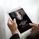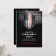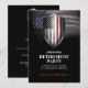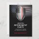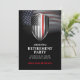 Escudo da linha vermelha fina na gloriosa bandeira americana tremulando contra um fundo preto. Um modelo de festa de aposentadoria elegante que é simples de editar. Este design elegante é adequado para aposentadoria ou formatura de bombeiros.