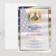 Foto pessoal decorada com folhas de louro douradas e uma moldura dourada sobre a gloriosa bandeira americana ondulando contra um fundo branco. Um modelo de convite de festa de aposentadoria elegante com foto que é simples de editar. Este design luxuoso é adequado para veteranos, militares, empregos relacionados ao governo, polícia ou empregos relacionados ao patriotismo.