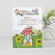 Confira este belo primeiro convite de aniversário com ilustração de aquarela, mostrando uma fantasia ensolarada paisagem florestal completa com um charmoso cogumelo e girassóis. Este design também apresenta borboletas e abelhas flertando sobre um belo campo com uma bela faixa floral de 'Primeiro Aniversário' feita à mão. A cor de fundo da polca dourada pontilhada para trás pode ser personalizada de acordo com o seu requisito.