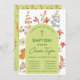 Um design floral para um batismo neutro em termos de gênero. O texto é verde, com uma cruz na parte superior, dentro a arco verde rodeado de flores silvestres pintadas em aquarela. O nome está escrito em script. A informação está em duas colunas, separadas por uma linha. No verso, há um padrão das mesmas flores silvestres sobre fundo azul. As flores silvestres são ilustrações botânicas de Margaret Armstrong (1867-1944), do "Field book of western silvestre", publicado em 1915, agora no dominio público.
