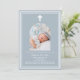 Fundo azul empoeirado, decorado com um quadro branco, e uma cruz branca Personalize e adicione um nome de foto e detalhes. Texto branco. Quadro fotográfico em forma de arco.