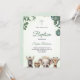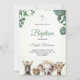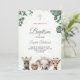 Baptism invitation featuring a watercolor jungle theme. Includes text with event details, surrounded by leaves and cute animal faces like a zebra, lion, elephant, and giraffe. Tone is charming and inviting. The back is a plain pastel green.
