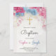 Baptism invitation with pink and blue floral border, a gold cross at the top. The text invites guests to the baptism of Sophia and Joseph.