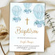 Baptism invitation with blue hot air balloons and gold cross. Features elegant script text announcing a ceremony, set on a light marble background.