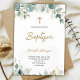 Front of a baptism invitation with elegant typography, featuring a gold cross and green leaves. The tone is serene and celebratory.
