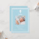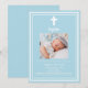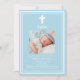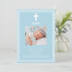 Um fundo azul claro, decorado com um quadro branco, e uma cruz branca Personalize e adicione um nome de foto e detalhes. Texto branco.