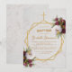 Este elegante desenho floral de batismo recomendado para o batizado de uma menina tem uma moldura dourada irregular geométrica com buquês de peônias vermelhas burgundy e brancas para cima e para baixo sobre dois hexágonos dourados que se sobrepõem, com uma cruz dourada no topo. O fundo é de mármore branco. O nome da criança é escrito em uma elegante fonte caligráfica; o resto é escrito em letras maiúsculas. Todo o texto tem uma cor amarela dourada, como a moldura dourada. Há uma borboleta amarela em cada peônia branca.
