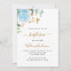 Um fundo branco decorado com folhagens de eucalipto, uma rosa azul clara e folhas douradas. Personalize com o nome da criança e detalhes da cerimônia. Letras pretas e douradas.