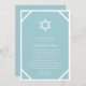 Este convite simples, para o Bar Mitzvah, apresenta uma Estrela branca de David, fundo azul e um quadro branco único. Informações e/ou fotos adicionais podem ser adicionadas à parte traseira da placa, se desejado.