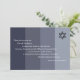 Quatro tonal preto e cinzas em sucessão de escuro a claro formam o fundo desse convite para o Bar Mitzvah. Seu texto branco personalizável impressão pelo comprimento da placa com uma estrela preta rica de David brilhando sobre tudo isso. Disponível com cartões de resposta correspondentes, favoritos e 4"x9,25" de tamanho de convite em cores alternativas com opções para o Bat Mitzvah.