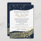Notas de música ouro e Estrela de David, Bar de música elegante Mitzvah convite em azul, branco e ouro da meia-noite, atualizado a partir de nossa música original no convite aéreo, o fundo azul pode ser mudado para qualquer cor. Personalize o texto e os estilos de fonte como preferido.