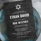O bar moderno mitzvah convida com White Star de David e tela escura e áspera Para mais produtos, solicitações personalizadas, vendas, notícias e muito mais, siga-nos no Facebook: @chaistationery