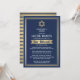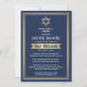 Quer amigos e familiares estejam praticando distanciamento social ou simplesmente vivam longe, conectem-se com eles online com uma cerimônia e celebração virtual de mitzvah bar. Este na moda moderno convite inclui textos para um evento online de longa distância via videoconferência via Internet e transmissão em direto. Todo texto é simples de personalizar, portanto pode incluir qualquer informação sobre o serviço, a leitura de Torah e a festa. É fácil personalizar o texto de recepção para uma parada de carro por carro, uma festa de jardim traseiro ou outro tipo de evento. (DICA DE IMAGEM: Uma maneira simples de centralizar uma foto exatamente como você deseja é recortá-la antes de carregá-la no site do Zazzle.) Design apresenta uma estrela azul e azul-marinho dourada de David, listras brancas e azuis- e uma tipografia inspirada no deco de arte elegante. Mazel Tov!