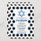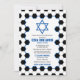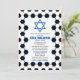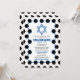 O futebol temeu o convite do Bar Mitzvah com um fundo de bola de futebol e sotaques azuis. Este Bar de futebol Mitzvah é na moda e moderno. Este convite do Bar Mitzvah para o tema futebol apresenta um padrão de bola de futebol preto e branco com uma estrela judia de David. As cores neste Bar de futebol exclusivo Mitzvah são azul, preto e branco. O nome do seu filho está em uma fonte ousada no estilo esportivo. Se você está pensando em hospedar um Bar Mitzvah de futebol esportivo, então esse convite exclusivo para o Bar Mitzvah pode ser a escolha perfeita.