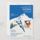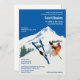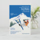 Este cartão moderno apresenta a paisagem de inverno de uma estância de esqui. Na frente, um esquiador corre pelo declive. Esta bela cena mostra montanhas nevadas e um céu azul intenso. Os pinheiros podem ser vistos espalhados. Este convite elegante e atraente é excelente para um amante de esqui ou um entusiasta de esqui.