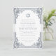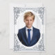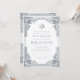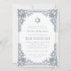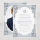 Este convite de bar mitzvah elegante com um ar vintage tem uma moldura ornamentada em folha de prata falsa com decorações barrocas elegantes. Acima do texto há uma estrela de David, também em prata falsa. Todo o texto pode ser personalizado e tem uma cor cinza semelhante à moldura de prata. O fundo é branco. No verso, há uma foto oval placeholder dentro da mesma moldura vintage.