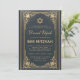 Este convite de bar mitzvah elegante com um ar vintage tem uma moldura dourada vintage com elegantes decorações barrocas em ouro sobre um fundo azul escuro semelhante a couro. O nome do menino é escrito em uma fonte caligráfica elegante. Todo o texto pode ser personalizado e tem uma cor dourada semelhante às decorações douradas da moldura.