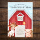 Este convite de festas personalizado apresenta um tema de fazenda giro, estilo aquarela. Uma imagem de um grande celeiro vermelho é colocada em segundo plano, com animais de fazenda bonitos em pé na frente. À direita está um porco bebê, e à esquerda está uma vaca bebê. Um pequeno pintinho está empoleirado na porta.