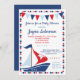 Um convite para chá de fraldas para garotos de veleiro girino. Em vermelho, branco e azul com uma bolinhas divertida.