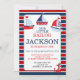 Primeiro aniversario temático náutico (ou qualquer idade) de um rapaz bonito com três embarcações de navegação, uma âncora sobre um quadro branco e marinho e fundo listrado vermelho. Personalize o texto você mesmo quando solicitar. Convite divertido para o aniversário do tema náutico.