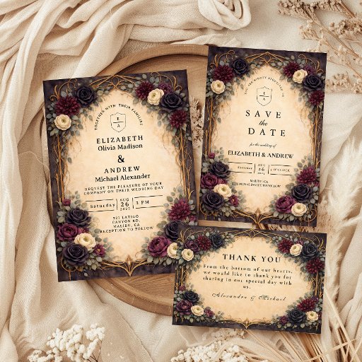 A richly detailed gothic design infused with baroque elegance, featuring deep plum, ivory, and muted charcoal florals woven into an ornate gold framework. The dramatic contrast between the dark, moody background and the warm parchment center creates a striking, romantic atmosphere. Delicate vines and antique-inspired detailing add a sense of old-world luxury, while the balanced composition keeps the layout refined and timeless. Perfect for couples drawn to dark romance, vintage opulence, and an unforgettable, statement-making celebration.