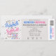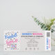 Baseball ou Softball Ticket Style Convite para uma festa de revelação de gênero, com um esquema de cores de cinza neutro com pop cor-de-rosa e azul.