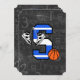 Design divertido de basquete para o jovem jogador de basquete ou fã de basquete. Destaque a letra S nas cores da equipe azul e branco com sapatos de basquete e basquete. O fundo apresenta design de quadro negro com termos e imagens de basquete