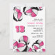 Este convite de festas temático de basquete giro para um aniversário ou festa de equipe apresenta clusters de basquete cor-de-rosa, preto e branco nas bordas superior e inferior do cluster de solteiro que cobre a parte de trás do convite - personalize os detalhes da festa em um fundo branco - por katz_d_zynes