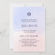 Este o na moda e o bastão na moda Mitzvah ou os convites de Mitzvah do bar caracterizam um fundo azul e cor-de-rosa da luz - da aguarela da lavagem. Sua informação aparece em uma mistura de uma tipografia escrita à mão mais escura, dos azuis marinhos do roteiro e de texto moderno de Sans Serif, e há igualmente uma estrela de David.