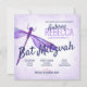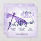 Celebre o seu morcego mitzvah com convites brancos roxos e lavandas de libélula! A textura roxa de aquarela com estrela brilhante de David ficará linda com convites, cartões rsvp, envelopes, etiquetas e adesivos correspondentes. Transfira facilmente esta design de libélula roxa deslumbrante para outras placas e presentes. Versátil para convites de festas de aniversários lilás, lavandas, roxas poeirentas.