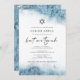 Este convite de bat mitzvah elegante apresenta um desenho de borda aquarela azul claro imitando mármore com veios de folha de prata falsa, desvanecendo-se gradualmente no fundo branco. As palavras "bat mitzvah" aparecem em escrita à mão em cinza carvão, com o texto restante em letras maiúsculas serifadas. O padrão de mármore azul e prata é repetido no verso do cartão.