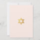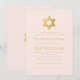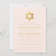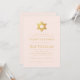 Um convite simples de bat mitzvah rosa e dourado cuja única decoração é a estrela de Davi em folha dourada na parte superior (e no verso). Todo o texto está em letras maiúsculas douradas e pode ser editado. O fundo é rosa claro.