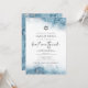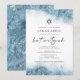 Este convite elegante de bat mitzvah apresenta um desenho de borda de aquarela azul claro imitando mármore com veias de folha de prata falsa, desvanecendo gradualmente no fundo branco. As palavras "bat mitzvah" aparecem em escrita à mão em cinza carvão, com o texto restante em letras maiúsculas serifadas. O padrão de mármore azul e prata é repetido no verso do cartão.