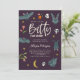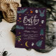 Cartão modelo de convite para chá de fraldas, tema bonito de halloween, com ilustração de morcegos bonitos, flores de noturna, crânios e estrelas. O texto diz "vamos morder por bebê." Excelente para um bebê que se espera que chegue ao outono.