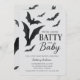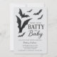 Tema do chá de fraldas de Halloween "Vamos morder por bebê" com ilustrações de morcegos assustadores em um fundo de cinza. Você pode personalizar isso facilmente com seus detalhes.