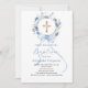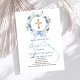 Um fundo branco elegante, decorado com flores azuis de cor aquosa em uma coroa, um arco azul e uma cruz ouro. Personalize e adicione um nome e detalhes.