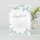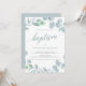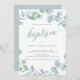 Um convite elegante para o batismo em azul e branco empoeirados, com folhas de cor aquática de eucalipto com "batismo" na caligrafia moderna, azul empoeirada. Personalize com seus detalhes na cinza.