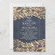 Convites Batismo Azul-Marinho Elegante de Folhagem Dourada