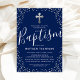 Convites de batismo/batizado masculino com fundo azul-marinho que pode ser alterado para qualquer cor, lantejoulas prateadas espalhadas elegantes, uma cruz religiosa e um modelo de texto moderno que é fácil de personalizar.