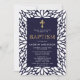 Convite para o batismo Elegante moderno, com a inscrição "Baptism" em folha de ouro, sobre fundo azul de marinho profundo e folha de ouro, com cruz atrás desenhada. Este convite de batismo moderno e personalizável, perfeito para o Batismo dos rapazes.