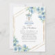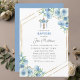Celebre o dia especial do seu pequeno com este belo convite para o Batismo, com uma elegante trama de cruz e dourada geométrica, e adornada com sotaques florais azuis e suaves. Perfeito para cerimônias de batismo masculino, essa design combina elementos religiosos tradicionais com uma aparência moderna e nova. Os delicados florais azuis e detalhes minimalistas criam um convite eterno que dá o tom para uma ocasião significativa e alegre. Personalize com todos os detalhes do evento para convidar amigos e família a compartilhar este marco sagrado.